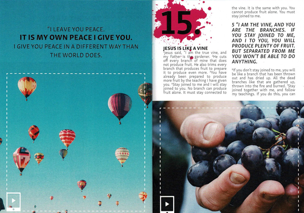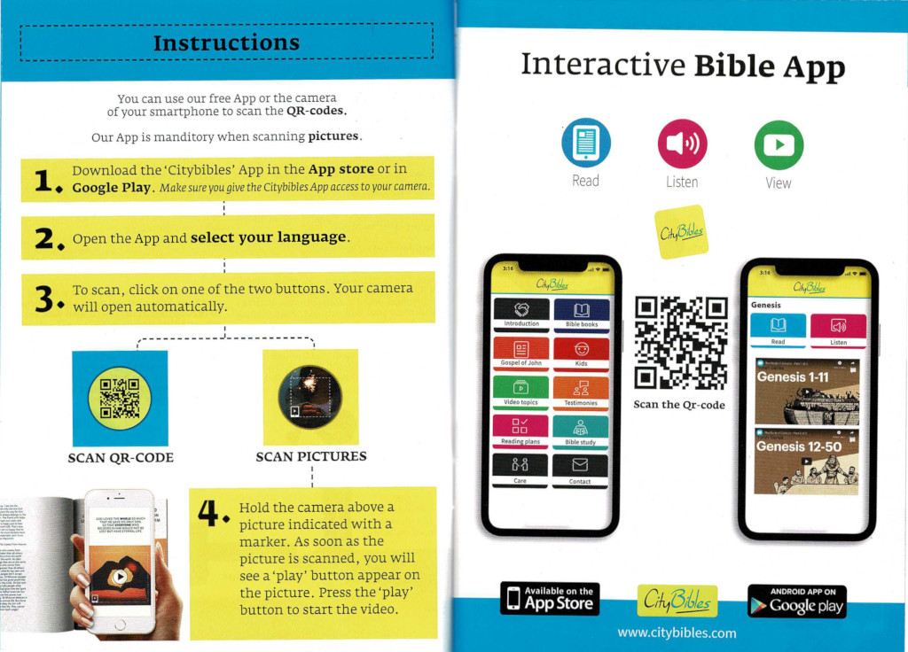 Auf dem Cover befindet sich auch ein QR-Code, über diesen können Interessierte die ganze Bibel online lesen. Zusätzlich gibt es dort Angebote wie z. B. Zeugnisse von anderen, Video- und Audiobeiträge, Lesepläne und auch spielerische Angebote für Kinder.