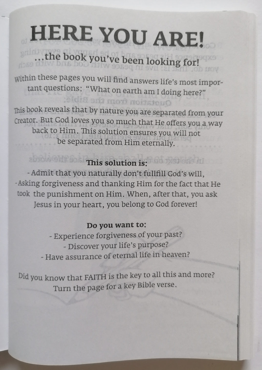 Vor dem eigentlichen Neuen Testament befindet sich ein Traktat mit dem Titel: "Was wählst Du?" Dieses Traktat ist ein sehr gutes Werkzeug für die Evangelisation. Es zeigt auf, warum wir auf dieser Erde sind und wie der Sinn des Lebens gefunden werden kann. Es gibt eine Perspektive über den Tod hinaus. In fünf Schritten wird erklärt, wie wir ewiges Leben bekommen.