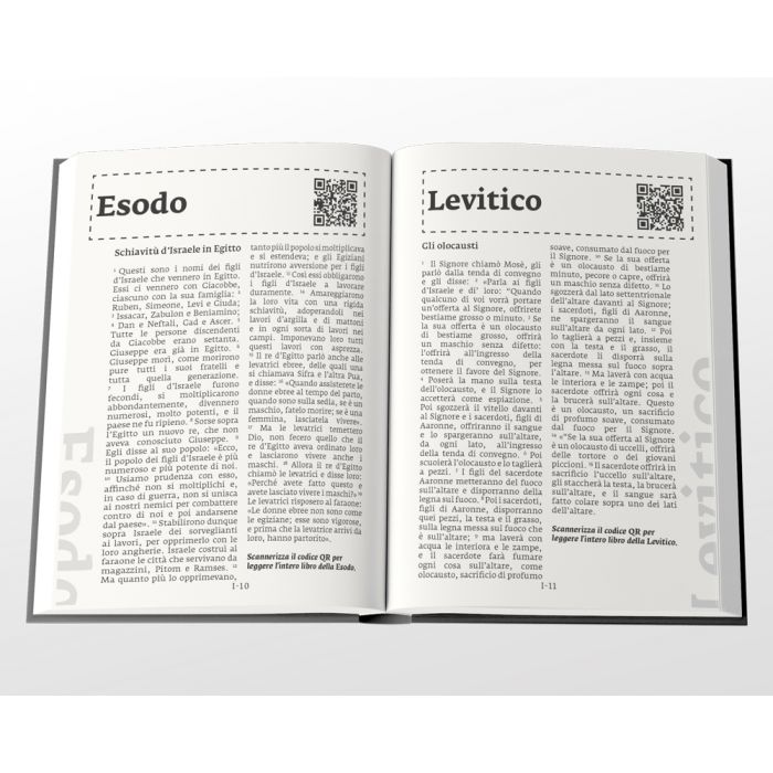 Jedes Buch aus dem Alten Testament hat eine eigene Seite, auf der sich der Anfang von dem jeweiligen Buch befindet, zusätzlich gibt es einen QR-Code um auf das gesamte Buch digital Zugriff zu erhalten.