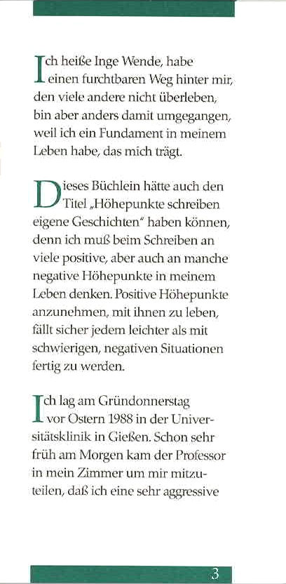 Inge Wende erhielt die Diagnose einer aggressiven Form von Leukämie. Die Behandlungen, die eine fürchterliche Tortur waren, führten aber dazu, dass sie frei von Krebs wurde. Als sie ein Rezidiv hatte und sich einer Knochenmarktransplantation unterziehen musste, empfand sie einen starken Frieden in Gott, der sie durch diese Zeit trug. Und sie durfte gesund werden.