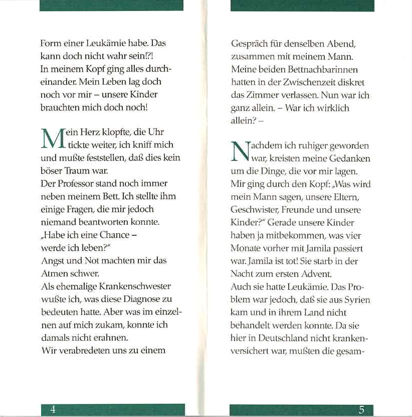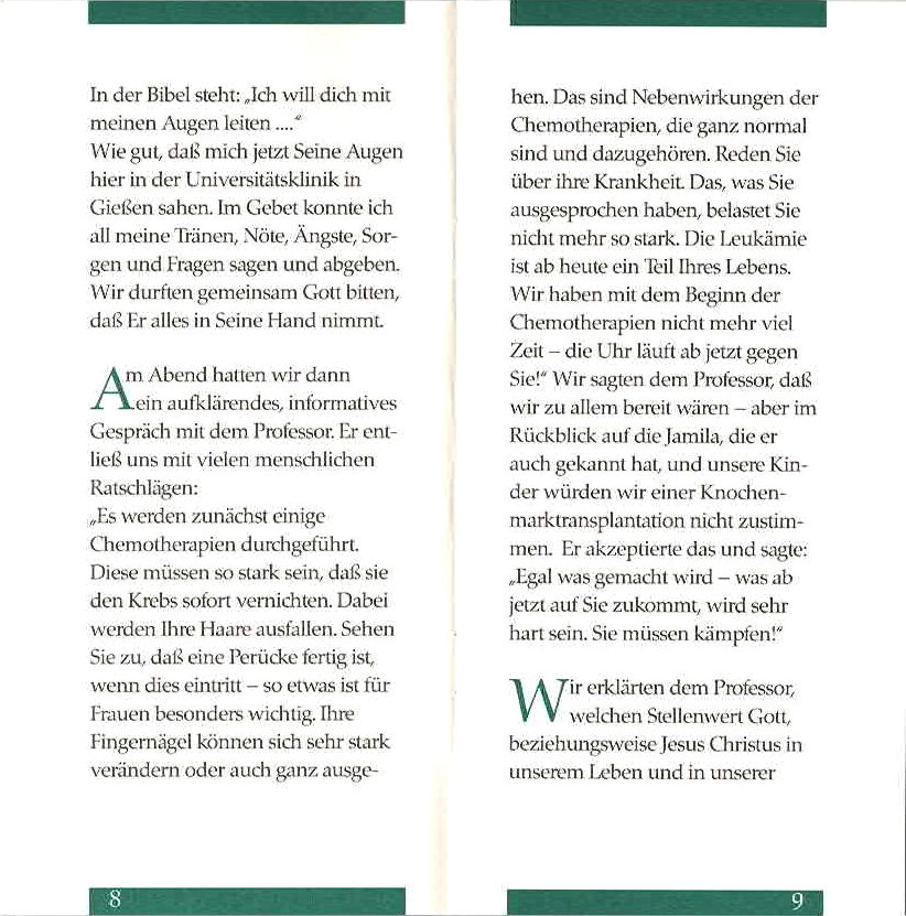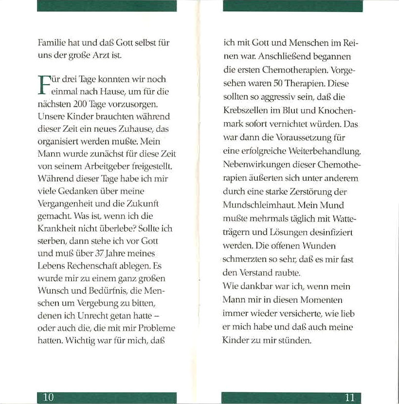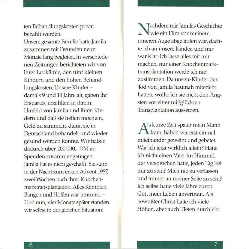 Seit dieser Zeit sehen sie und ihr Mann es als ihre Aufgabe an, betroffenen Familien Hilfestellung zu geben, ihnen Mut zu machen und sie mit Gottes Wort und Gebet begleiten. Daraus ist das Missionswerk Leben & Hoffnung e.V. entstanden. Die Broschüre Mein Leben zwischen Angst und Hoffnung gibt es in vielen Sprachen. Sie ist für Menschen in Krisen geeignet, die sich in einer schwierigen (gesundheitlichen) Lebenssituation befinden. Damit geben Sie Ermutigung und Hoffnung weiter und dass es möglich ist, Jesus in seinen Umständen zu erleben.