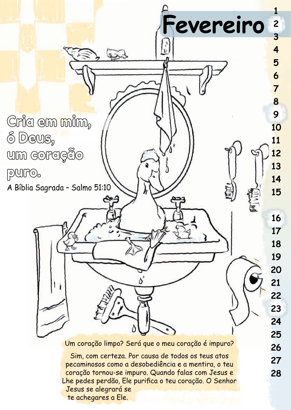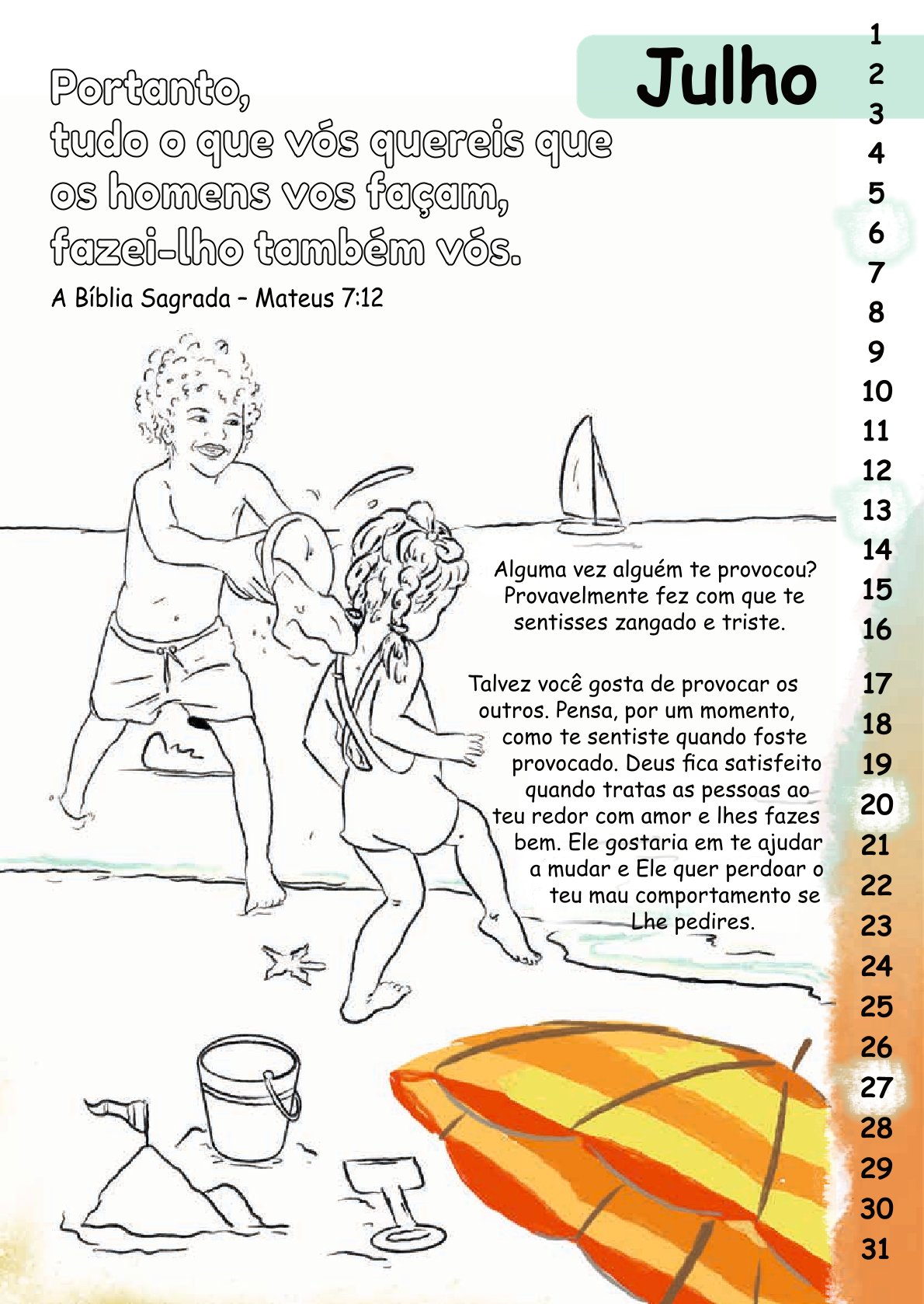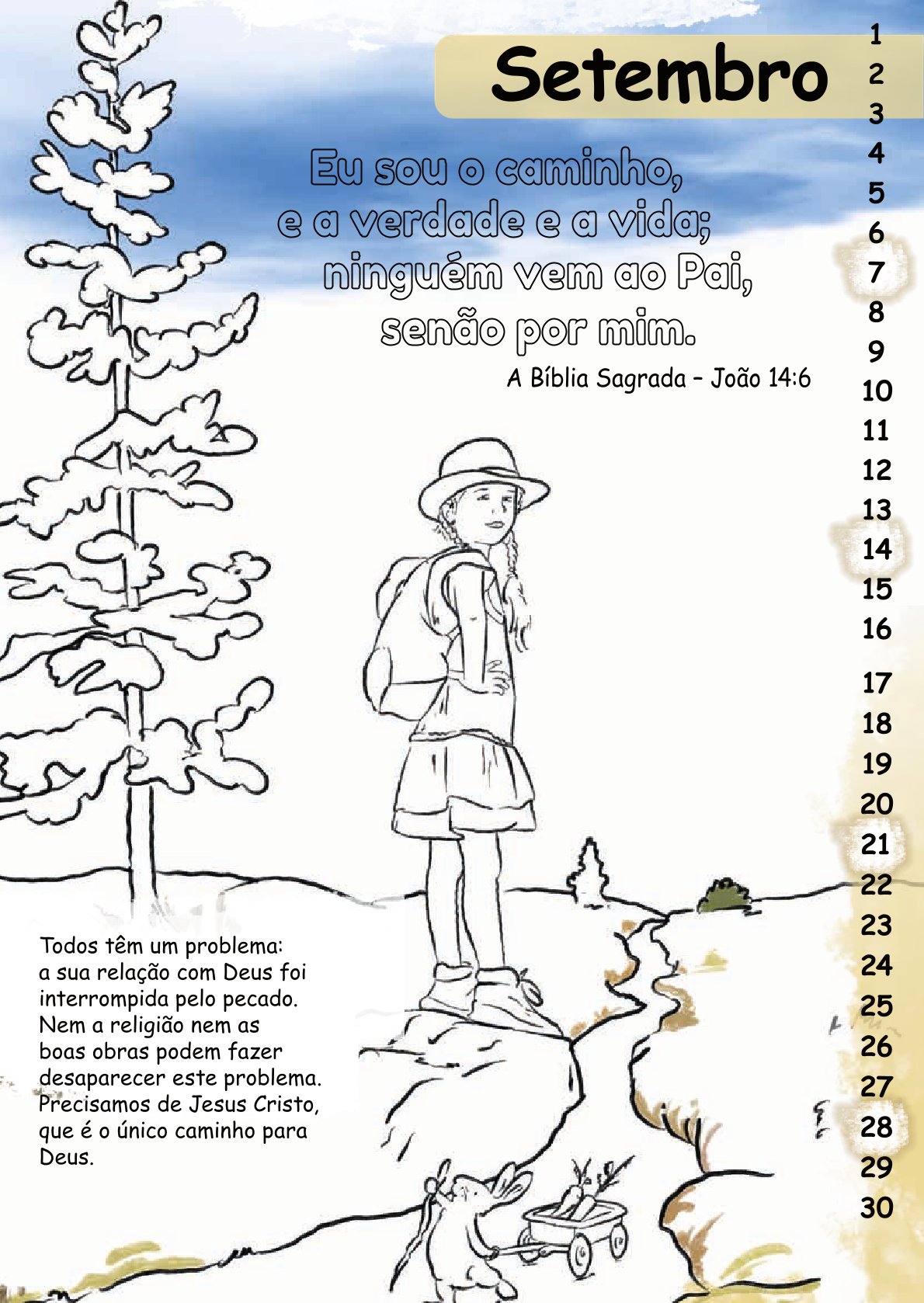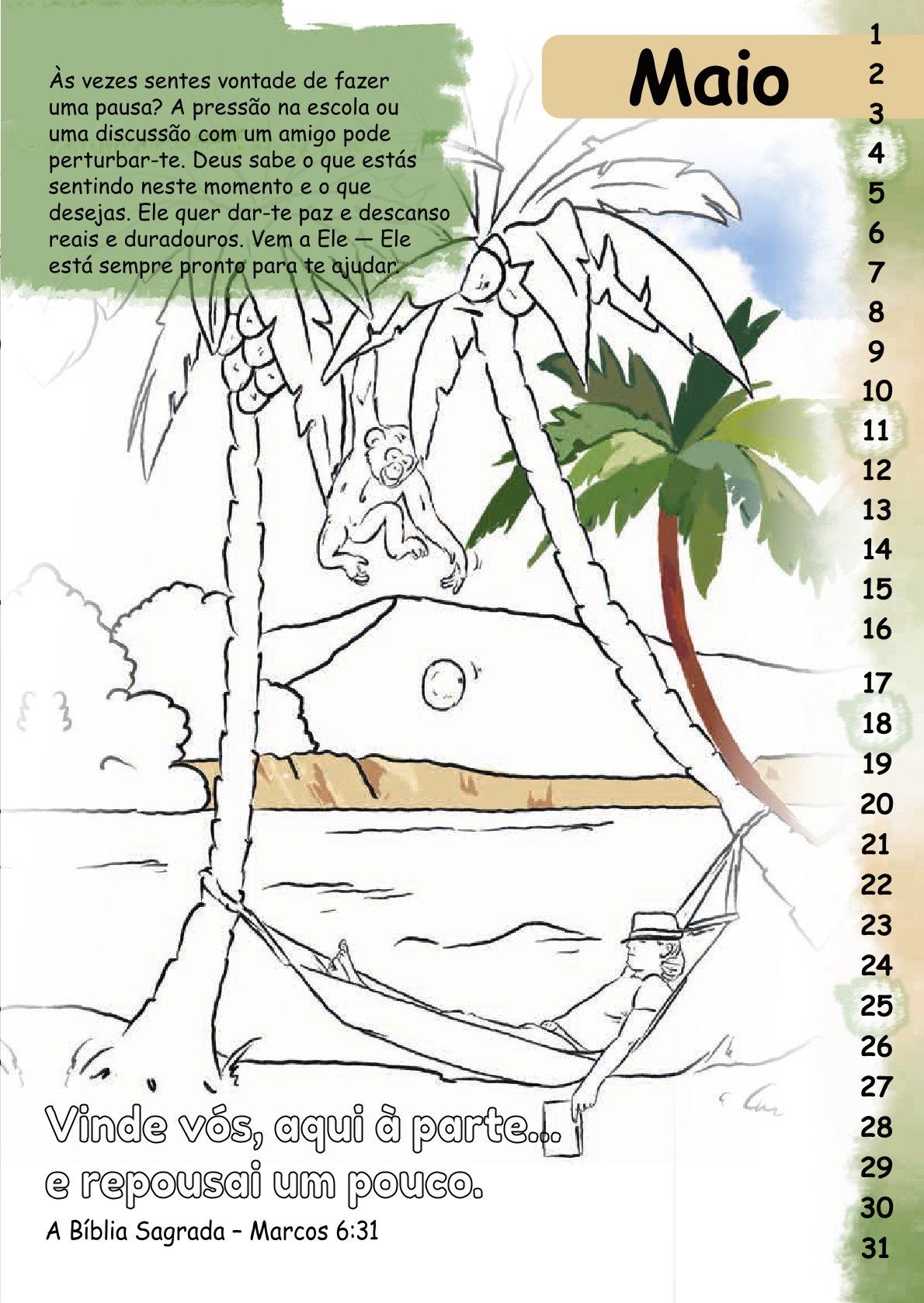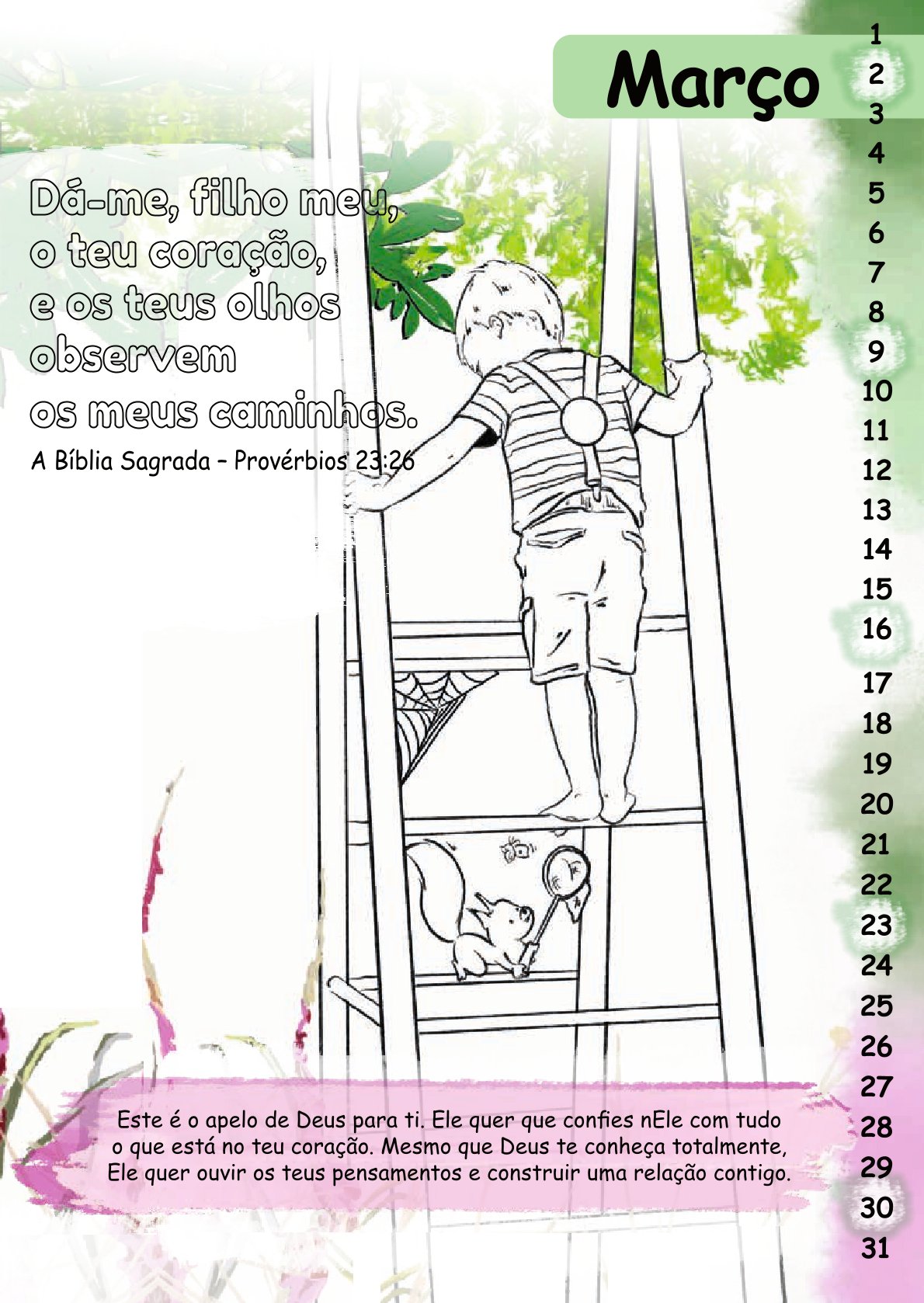 Der Malkalender Mit Stift und Bibel enthält für jeden Monat einen Bibelvers mit einem thematisch dazu passenden Bild zum Ausmalen.