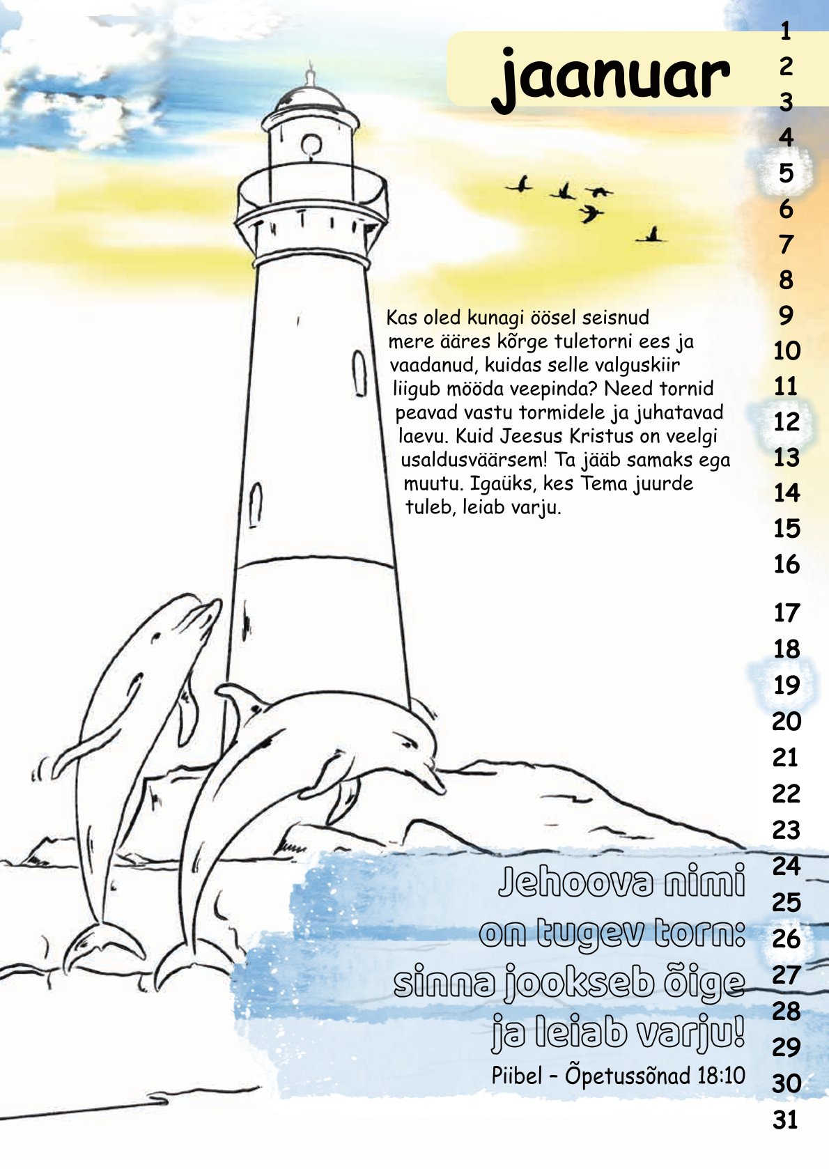 Der Malkalender Mit Stift und Bibel enthält für jeden Monat einen Bibelvers mit einem thematisch dazu passenden Bild zum Ausmalen.