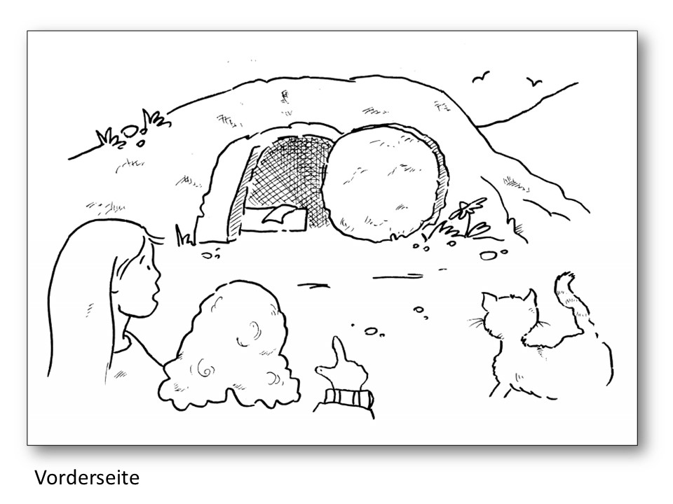 Diese doppelseitig bedruckte Postkarte im A6-Format mit Zeichnungen von Ruth Kerkmann eignet sich als Zusatzartikel zum Osterheft für Kinder, kann aber auch ohne das Heft eingesetzt werden: