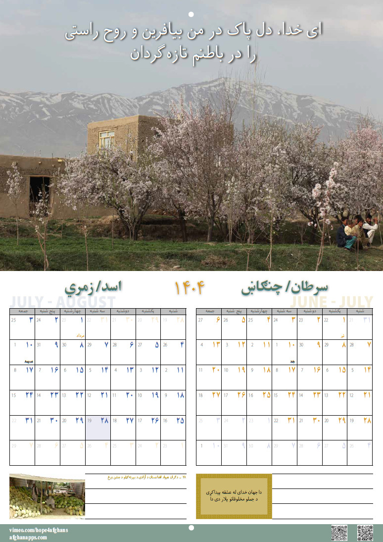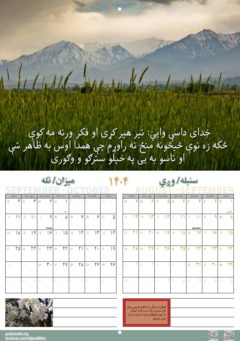 Die begleitenden Bibelverse, afghanischen Sprichwörter und Gedichte in Dari und Paschtu sollen die Afghanen ermutigen, Gott kennen zu lernen. Auf jeder Seite sind Links zu Websites und sozialen Medien angegeben.