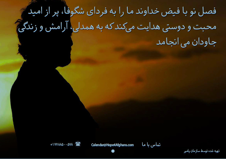 Text in Dari: „Die Gnade Gottes, wie eine neue Jahreszeit, führt uns zu einem blühenden Morgen, wo Hoffnung und Anstrengung auf die Herzen scheinen wie die Sonne. Auf diesem Weg führen Liebe und Freundschaft, wie eine sanfte Brise, die Seelen zu Mitgefühl, Frieden und ewigem Leben.“